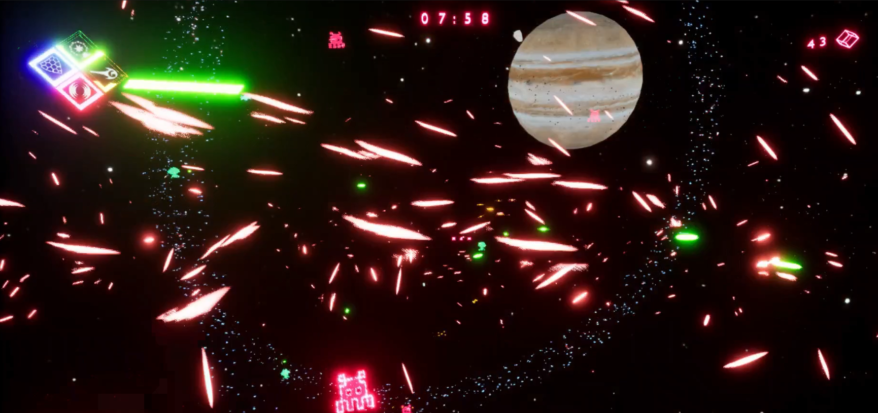 Dive into an audiovisual trip where space enemies, synthesizers and pulsing neon merge into a frenetic arcade experience.